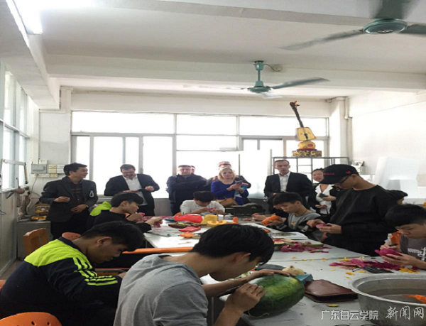 上午11点,代表团到达广州市白云工商技师学院。他们首先参观了以学生为主角,融学生实践教学、师生餐饮服务和西餐文化交流于一体实训中心-新开业的云涛轩西餐厅。随后在餐厅用餐,代表团对云涛轩西餐厅的西式设计、师生们的精湛职业技能和工学结合的教学模式表示高度赞赏,同时在提高学生餐厅服务方面提出了中肯的意见。