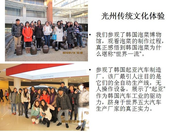 大家亲身体验了由kara和bigbang的舞蹈老師JOY DANCE 上的K-Pop以及K-Pop Dance: JOY DANCE ACADEMY & PLUG IN MUSIC现代舞蹈课;;湖南大学教授教我们学习了跆拳道和化妆知识;光州传统文化馆师傅们教了我们泡菜制作方法;参观了起亚汽车厂;探访了光州市政府国立光州科学院和光州南区老人福利会馆;游览了顺天湾自然生态公园,、乐安民俗村、宝城绿茶度假村,观看了国乐演出等;在韩国湖西大学的安排下,体验了滑雪活动。对于鲜少见雪的南方学生来说,这一安排既刺激又新奇,个个都流连忘返。